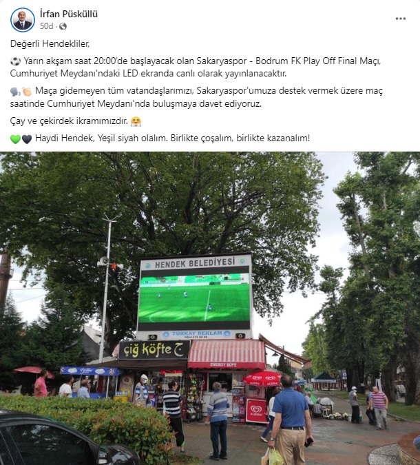 Bir şehir kilitlendi tek yürek oldu 30-05 2024 perşembe saat 20-00’da sakaryaspor'un Bodrum FK ile oynayacağı Play Off Final mücadelesine saatler kala bir çok belediyeden peş peşe canlı yayın haberleri gelmeye devam ediyor son olarak Hendek Belediye Başkanı İrfan Püsküllü Sosyal medya sayfasından şampiyonluk maçının Cumhuriyet Meydanından canlı yayınlanacağını sosyal medya sayfasından duyurdu ardından Hendek Belediyesi Basın birimi yaptığı haberi servis etti Henek Basın birimi yaptığı açıklamada Sakaryaspor'un Bodrum FK ile oynayacağı Play Off Final mücadelesinin Hendek Cumhuriyet Meydanı’nda bulunan LED ekrandan canlı olarak yayınlanacağı duyuruldu. 30 Mayıs Perşembe günü (yarın akşam) saat 20:00’de başlayacak olan karşılaşma, maça gidemeyen Sakaryaspor sevdalıları için meydanda bulunan LED ekrandan canlı olarak izlenebilecek.